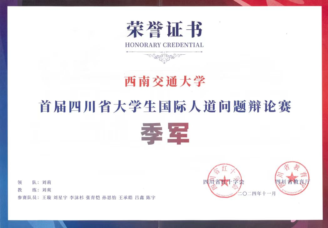 2024年11月23日,首届四川省大学生国际人道问题辩论赛决赛暨颁奖活动在成都举行。该赛事由四川省红十字会、四川省教育厅联合主办,四川日报报业集团《文摘周报》承办。我院2024级法学硕士研究生刘星宇、2022级法学辅修本科生孙思怡代表校辩论队参赛,我院吴昱副教授应校红十字会邀请进行专业指导,我校荣获季军。