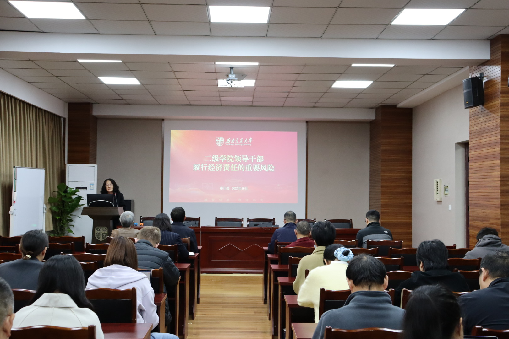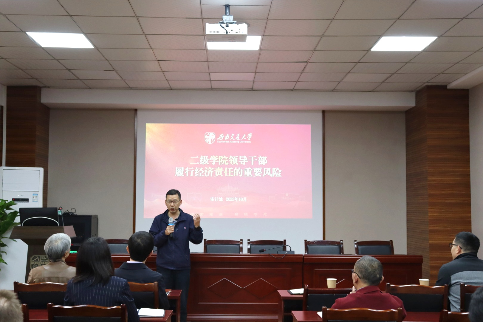 会议伊始,审计处处长俞建海和副处长黄海霞以 “权、责、廉” 为核心要义,系统解读经济责任审计的核心要求与实践路径。黄海霞强调,学院干部作为公共资源管理的关键主体,审计工作需全面覆盖政策落地成效、决策科学性等关键领域,严格遵循 “党政同审”“任中审计为主” 的工作原则,推动监督管理常态化、长效化。她通过PPT 直观呈现 “六大经济责任” 体系,从法律法规执行到问题整改闭环,全方位涵盖经济工作关键环节。同时,结合典型案例深度剖析国家政策落实不到位、“三重一大” 决策不规范、资产安全管理疏漏等十大风险点,以 “案例警示+风险拆解” 的方式,为全体教职工敲响规范用权、廉洁履职的警钟。