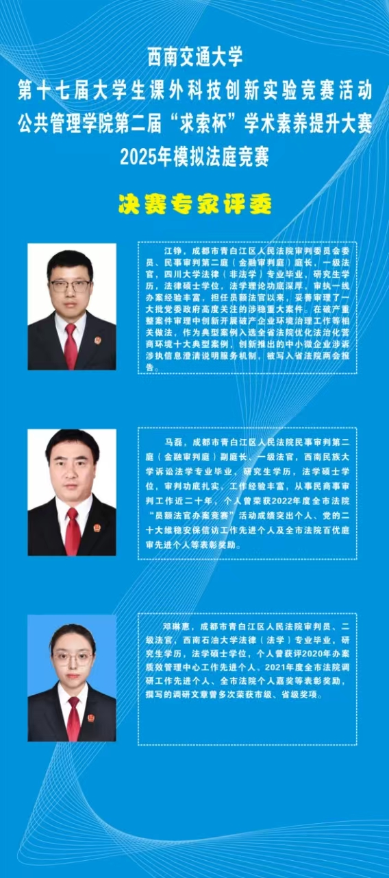 由西南交通大学教务处、校团委主办,公共管理学院、成都市青白江区人民法院承办的西南交通大学第十七届大学生课外科技创新实验竞赛(本科生),以及由西南交通大学研究生院主办,公共管理学院、成都市青白江区人民法院承办的第二届“求索杯”学术素养提升大赛(研究生)2025年模拟法庭竞赛在4月初拉开帷幕,初赛中青白江区人民法院的三位法官对28支参赛团队提交的司法文书进行了专业评审,16支参赛团队脱颖而出晋级复赛,经过复赛4个赛场的言辞辩论评审,2支本科生参赛队和2支研究生参赛队晋级模拟法庭竞赛决赛,现对决赛赛事安排如下: