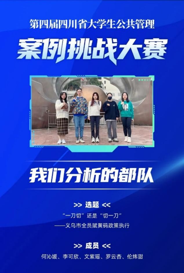 2022年12月11日,四川省第四届公共管理案例挑战大赛决赛在西南财经大学成功举行,由我院严敏老师指导,政治学与行政学专业2021级本科生何沁媛、李可欣、罗云杏、伦炜甜和公共事业管理专业2021级本科生文紫瑶组成的参赛队伍在比赛中斩获“一等奖铜奖”佳绩。