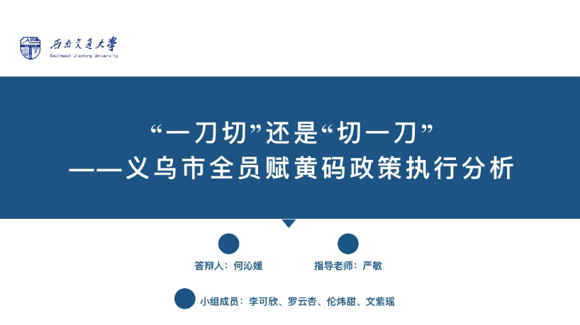 本次大赛分为初赛、复赛和决赛三个阶段,历时半年。我院学子在指导老师悉心指导下,完成了从开题报告、调研设计、实地访谈、报告撰写、现场答辩的全过程,历尽数次修改、调整和完善,最终凭借高质量文本《“一刀切”还是“切一刀”——义乌市全员赋黄码政策执行分析》从众多参赛队伍中脱颖而出,与各高校参赛队伍同场竞技、切磋交流,获得评委专家的一致肯定。