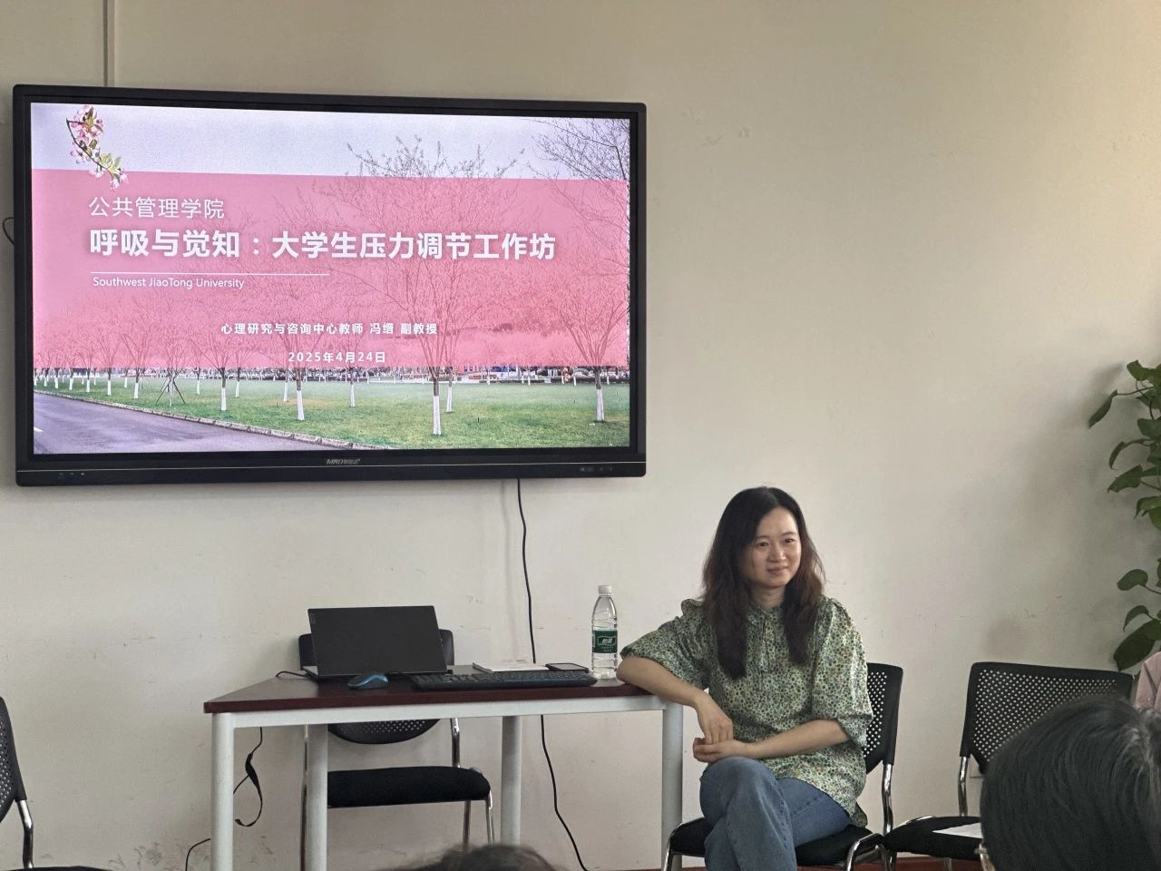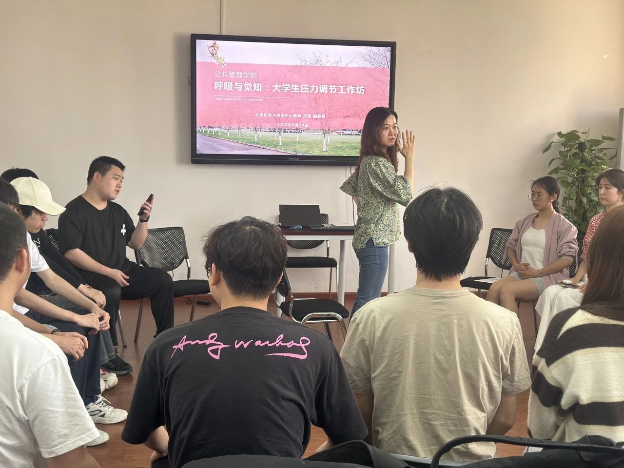 在大学校园里,学业的繁重、社交的复杂、未来的迷茫,让诸多同学深感压力在肩如影随形。这些压力正悄然侵蚀着大家的身心健康,不少同学陷入焦虑、失眠的困境。为帮助同学们缓解压力,释放自我,西南交通大学公共管理学院于4月24日下午4:00在0号教学楼01108教室开展“呼吸与觉知:大学生压力调节工作坊”活动。心理研究与咨询中心冯缙老师带领同学们进行了一场沉浸式的身心放松之旅。