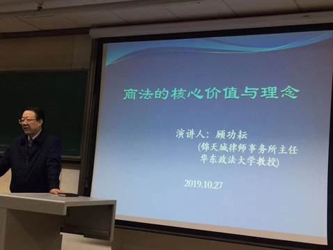 2019年10月27日晚七点,应西南交通大学邀请,原华东政法大学副校长、现任华东政法大学教授、博士生导师,上海市锦天城律师事务所主任顾功耘教授向西南交通大学公共管理与政法学院法律系的教师代表及全体同学作了名为《商法的核心价值与理念》的专题讲座。顾功耘教授现任中国法学会商法学研究会副会长、中国法学会经济法学研究会副会长、上海市法学会商法研究会会长、上海市法学会经济法研究会会长、中国国际经济贸易仲裁委员会仲裁员等职。顾教授不仅具备深厚的法学理论功底与教学实践能力,而且拥有丰富的商事法律实务经验。