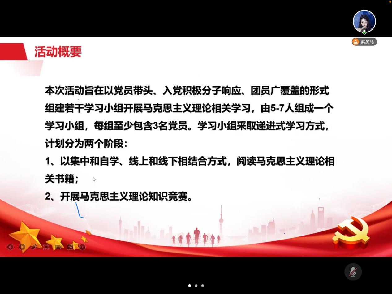 最后蔡笑晗同志对本学期第三次党支部书记工作例会的内容进行传达,并对研究生马克思理论旗帜学习小组活动进行了安排,介绍了活动概要、活动分组规则、活动阶段、学习形式等,并推荐了马克思理论的相关书籍,以为后续更好的开展旗帜学习小组学习活动。