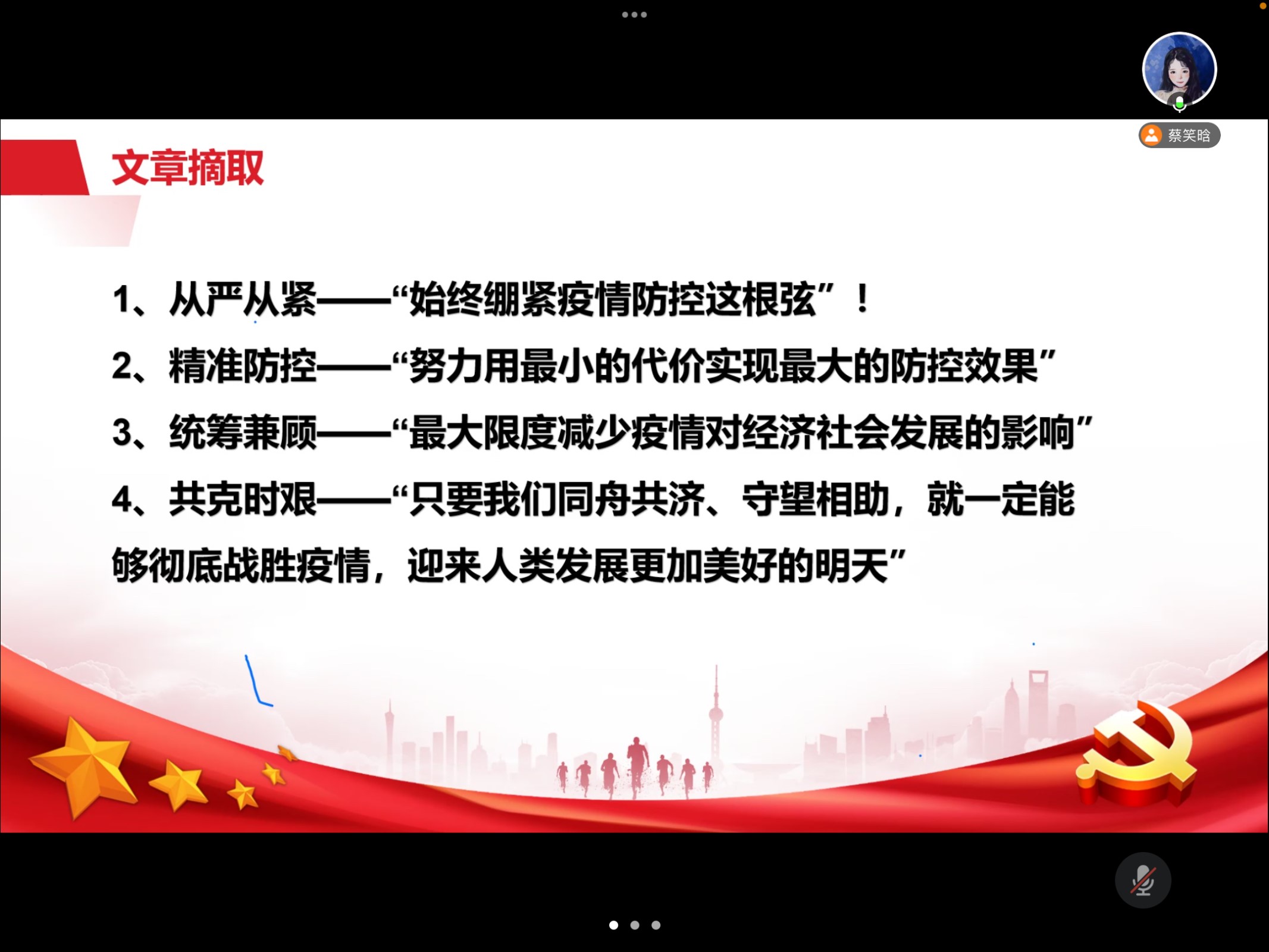 为了积极响应国家和学校抗击疫情的号召,引导学生党员正确认识当前疫情防控形势,坚决服从学校疫情防控工作安排,坚决听从指挥,严格落实“非必要、不离校”的要求,硕士2021级公共管理第一党支部于4月12日下午集体进行《“始终坚持人民至上、生命至上”——习近平总书记指挥打好统筹疫情防控和经济社会发展之战述评》的线上学习暨“旗帜学习小组”活动安排的相关事宜。