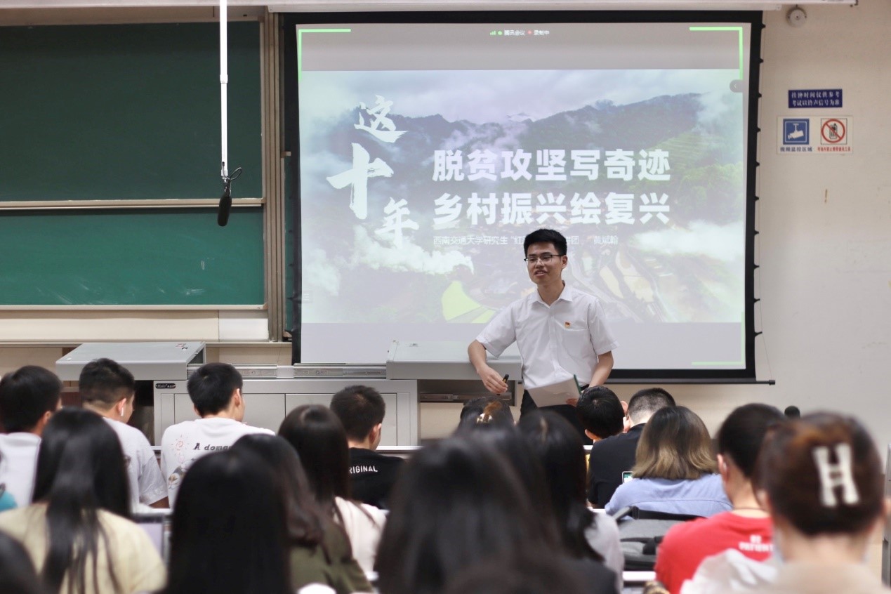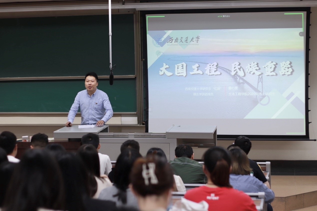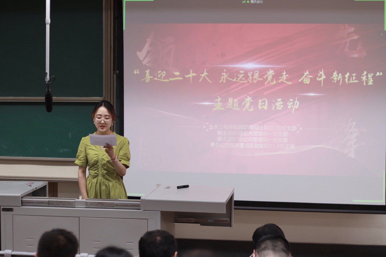 为迎接党的二十大胜利召开,深入学习贯彻习近平新时代中国特色社会主义思想,深入领会党的十八大以来党和国家事业取得的历史性成就、发生的历史性变革,2022年5月27日晚7:30,土木工程学院2021级硕士隧道1班党支部联合硕士2020级公共管理第一党支部、硕士2021级公共管理第一党支部和牵引动力国家重点实验室研21-3党支部于J4323共同开展研究生党建“领航先锋”工程——“喜迎二十大、永远跟党走、奋进新征程”主题党日活动。本次活动有幸邀请到三位研究生“红路”理论学讲团成员——韩沁儒、童心豪、黄斌翰为大家带来精彩的宣讲。