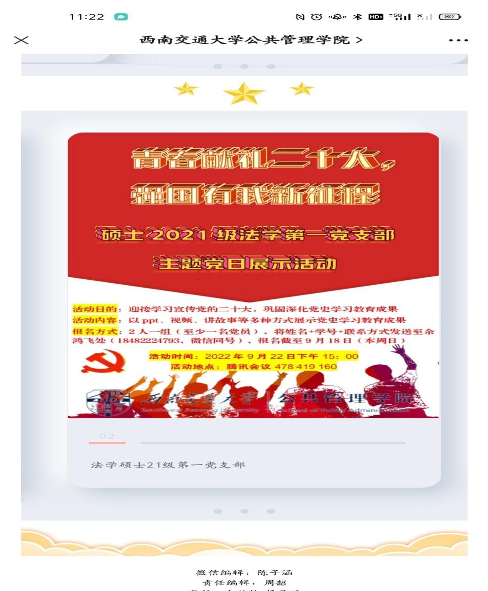 为迎接学习宣传党的二十大,在同学中广泛宣传党的十八大以来党和国家事业取得的历史性成就、发生的历史性变革,宣传习近平总书记对同学们的关心关怀,学习党领导中国青年运动的光辉历程,引导各党员同志深刻感悟“两个确立”的决定性意义,增强“四个意识”、坚定“四个自信”、做到“两个维护”的重要意义;同时为实现第二个百年奋斗目标、实现中华民族伟大复兴的中国梦凝聚起强大青春力量,激励全体党员同志攻坚克难、开拓奋进,9月22日下午硕士2021级法学第一党支部面向公共管理学院全体研究生组织开展了“青春献礼二十大,强国有我新征程”主题党日展示活动。因疫情防控要求,本次活动会议在腾讯会议上展开。