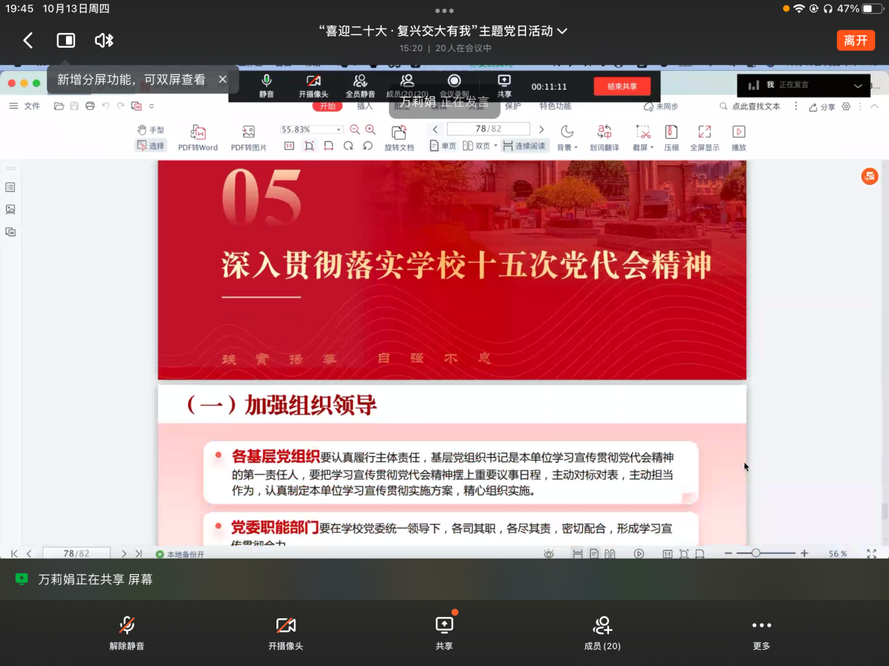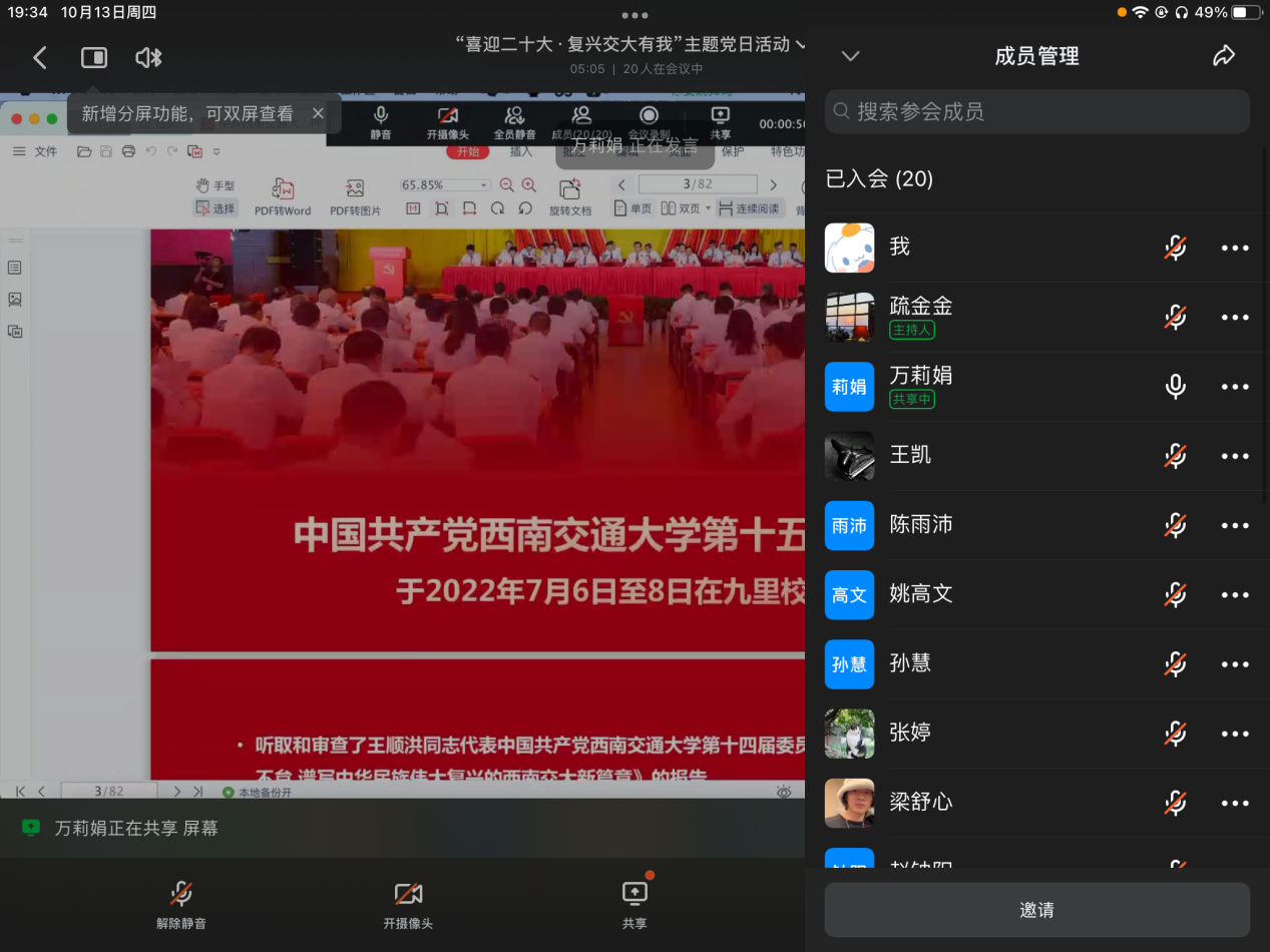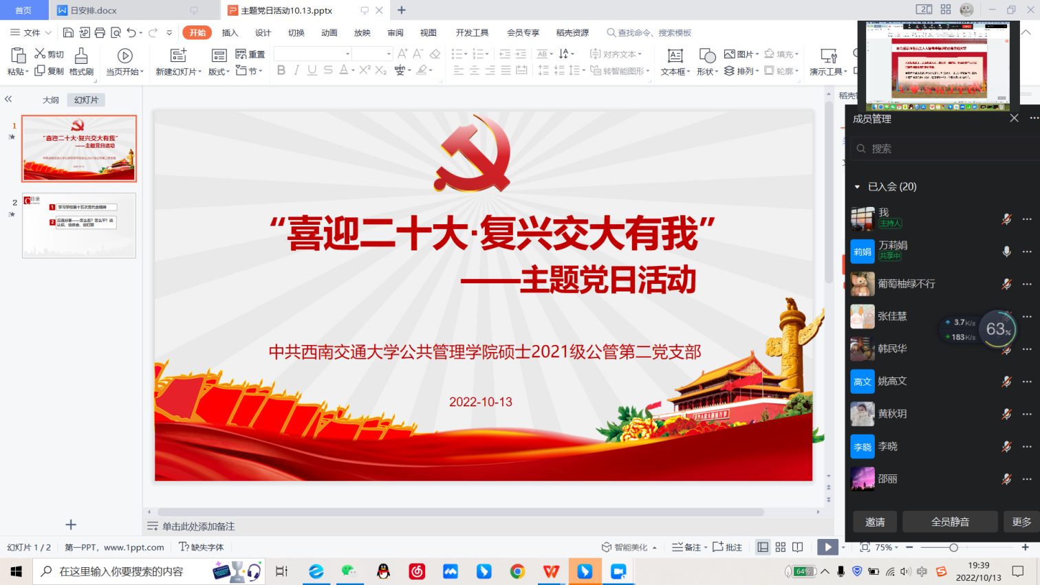 为深入学习贯彻西南交通大学第十五次党代会精神,为学生党员成长成才指引方向,2022年10月13日晚,硕士2021级公共管理第二党支部在支部钉钉群通过钉钉会议开展了主题党日活动。本次学习以“喜迎二十大·复兴交大有我”为主题,开展贴近党员实际、主题突出、内容丰富的主题党日活动,组织党员深入学习学校第十五次党代会精神。硕士2021级公共管理第二党支部全体党员参加了此次学习活动,活动由党支部书记疏金金主持、支部成员万莉娟同志主讲,各位党员同志对本次大会重要精神及报告内容进行了学习,并展开了热烈讨论。