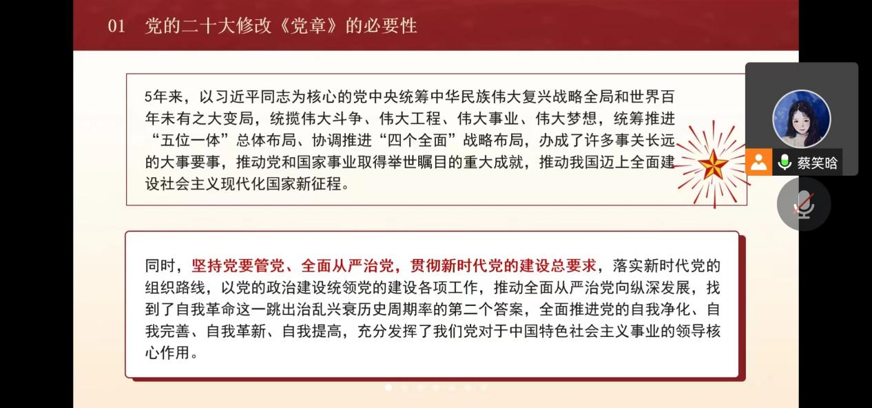 随后,蔡笑晗同志带领大家学习了新党章主要修订内容,为了进一步增加大家对新党章的理解,蔡笑晗同志还为大家介绍了新旧党章的区别。新党章在以下内容做出了调整:新党章充实完善习近平新时代中国特色社会主义思想的科学内涵和历史定位;对党的奋斗目标的表述作了调整和完善;增写党的百年奋斗重大成就和历史经验;对关于社会主义初级阶段的相关内容作了调整和充实;在“五位一体”总体布局方面进行充实;对国防和军队建设、统一战线、外交工作等方面的内容作了修改;对党的建设总体要求作了调整充实;在坚持党的全面领导方面进行了充实;对党员和党的干部提出了新要求;对党的基层组织和党组作出了新规定;对党的纪律、党的纪律检查机关两章作了调整和完善。