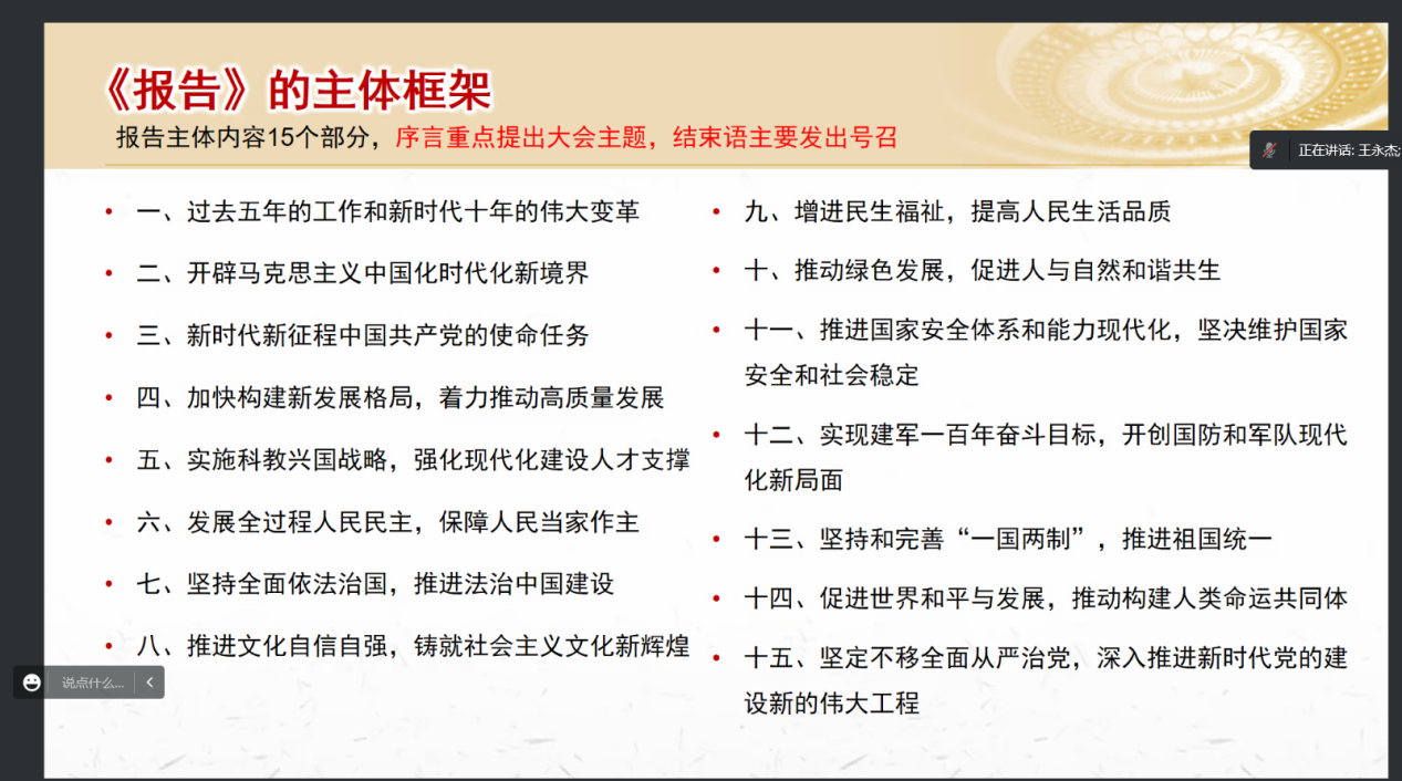 为贯彻学校《关于做好党的二十大精神学习培训的工作提示要求》,深入学习贯彻党的二十大精神,深刻回顾党和国家在发展进程中取得的重大成就,引导激励广大师生党员坚定理想信念,奋进新征程,建功新时代,2022年12月15日上午8:50,公共管理学院教工法学系党支部和硕士2022级法学第一党支部邀请学院党委委员、院长王永杰教授在腾讯会议为大家开展学习二十大专题党课宣讲活动。
