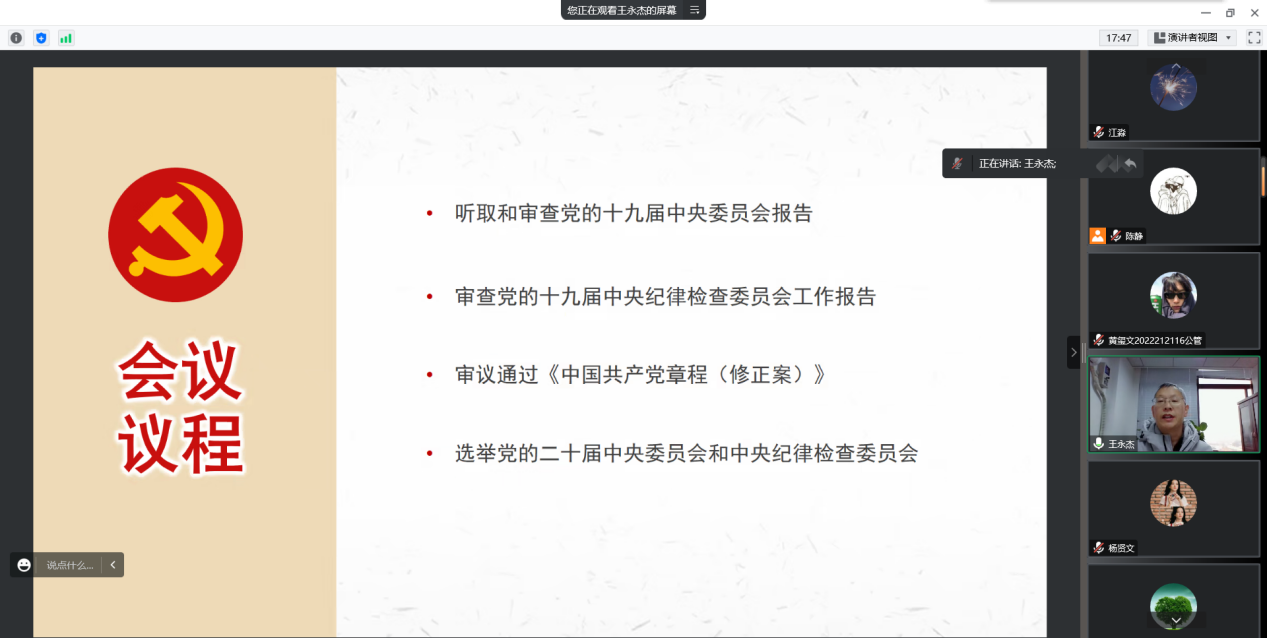 此次领学党的二十大精神,王永杰教授从7个“深刻把握”系统阐述和深入解读了党的二十大精神,带领大家全面领会党的二十大报告主要内容及主要成果,全面回顾了党的十九大以来5年的伟大成就和新时代10年的伟大变革,深刻阐明了伟大变革的里程碑意义。王院长嘱咐青年党员要认真学习领会党的二十大精神,紧密团结在以习近平同志为核心的党中央周围,高举中国特色社会主义伟大旗帜,全面贯彻习近平新时代中国特色社会主义思想,牢记空谈误国、实干兴邦,坚定信心,同心同德,埋头苦干、奋勇前进,为全面建设社会主义现代化国家、全面推进中华民族伟大复兴作出四川更大贡献!