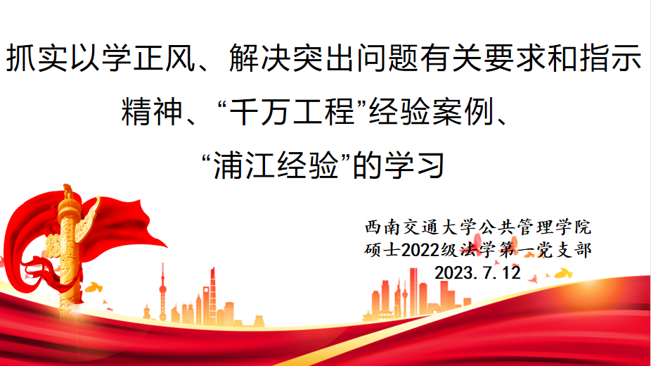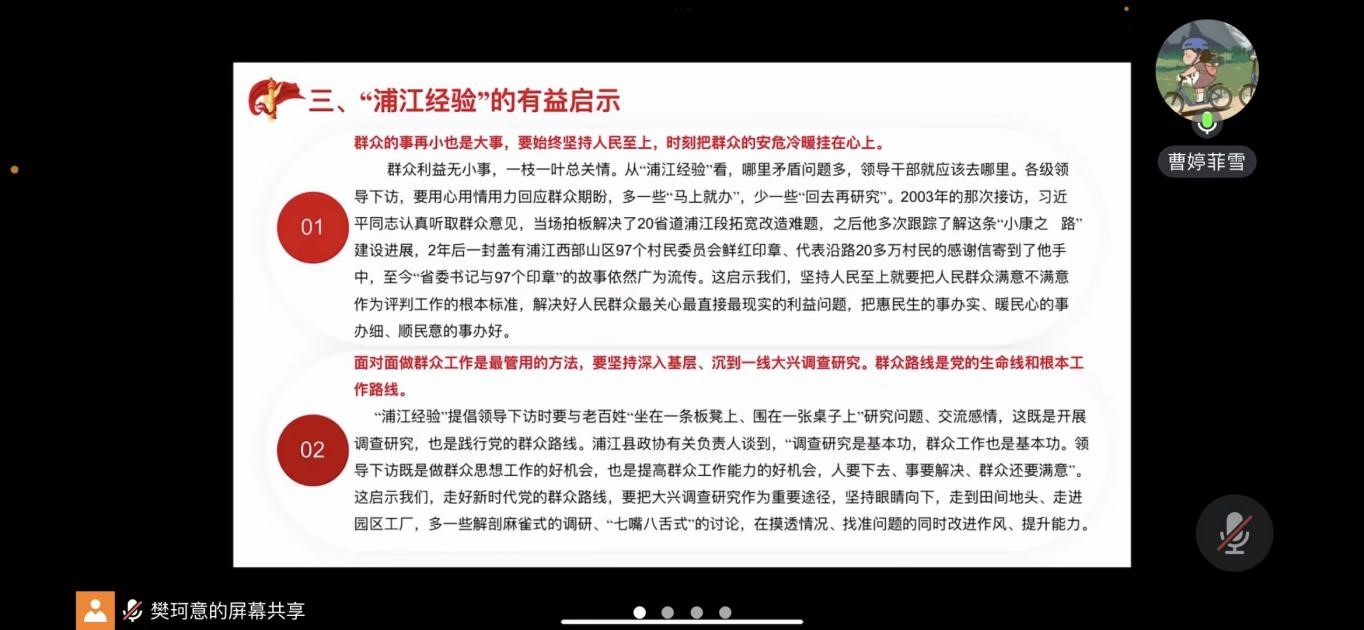 2023年7月12日20:00,公共管理学院硕士2022级法学第一党支部于线上腾讯会议开展“习近平总书记在内蒙古调研时对抓实以学正风、解决突出问题有关要求和指示精神、‘千万工程’经验案例,学习运用好‘浦江经验’”主题教育政治理论学习。本次学习由第二党小组同志主讲,全体党员和入党积极分子参加。