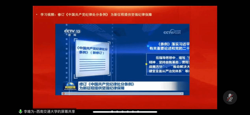 5月9日,本科公管党支部在党支部书记李唯为同志的带领下,回顾了《中国共产党纪律处分条例》修改的重大历史意义和现实意义,从篇章结构的角度对《条例》基本框架和主要内容进行梳理,并通过观看《新闻联播》《朝闻天下》等新闻片段,进一步加深对相关知识的理解与运用。