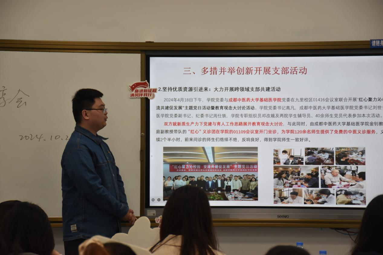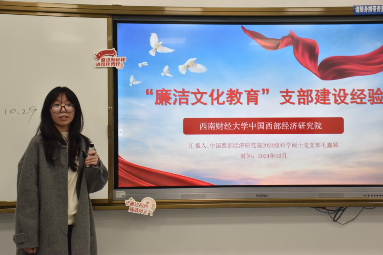 在“花语廉心”廉洁文化教育基地的参观结束后,活动转至西南财经大学经世楼B108室内进行。三所学校的学生代表围绕廉洁文化主题进行了各具特色的PPT展示,从不同的角度分享了各自学校在廉洁教育方面的实践与成果。西南交通大学公共管理学院的学生党员代表庞鸿源,以“廉洁铸魂强根本,挺膺奋进建新功”为主题,从何为廉、为何廉、何以廉三个角度穿起西南交通大学公共管理学院对于新时代廉洁党政工作的理解和作为,学院秉持以“廉”促教、以“廉”育人的工作理念,把加强校园廉洁文化建设作为一体推进“三不腐”的基础性工程和落实立德树人根本任务的重要举措,持续深耕校园廉洁文化建设,打造廉洁文化教育阵地,推动清正廉洁政治底色根植人心;成都中医药大学的学生党员代表文莎莎,则是以案例带领大家深入思考,警示同学们不能犯红线错误,要留清白在人间。并在展示的过程中,抛出问题“青年何以清廉”将廉政建设的种子播撒在每个人的心中;最后是西南财经大学的学生党员代表毛鑫硕,鲜明直接的切入主题,分享了在新时代廉洁文化建设中,西南财经大学党支部的角色定位和具体作为。