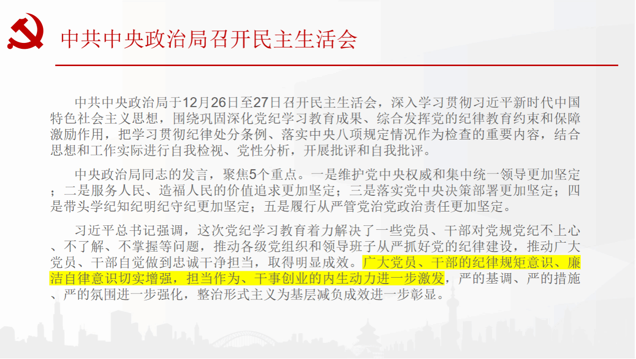 硕士法学第一党支部组织学习了习近平总书记在中共中央政治局民主生活会上的重要讲话精神,会上,党员同志们认真聆听讲解、积极互动交流。大家深刻认识到,习近平总书记的重要讲话为加强党的纪律建设指明了方向,是全体党员在新时代必须遵循的行为准则。通过线上学习,同志们纷纷表示,要持续深化党纪学习教育成果,将党的纪律内化于心、外化于行,以更加严格的标准要求自己,为营造风清气正的校园政治生态贡献力量。