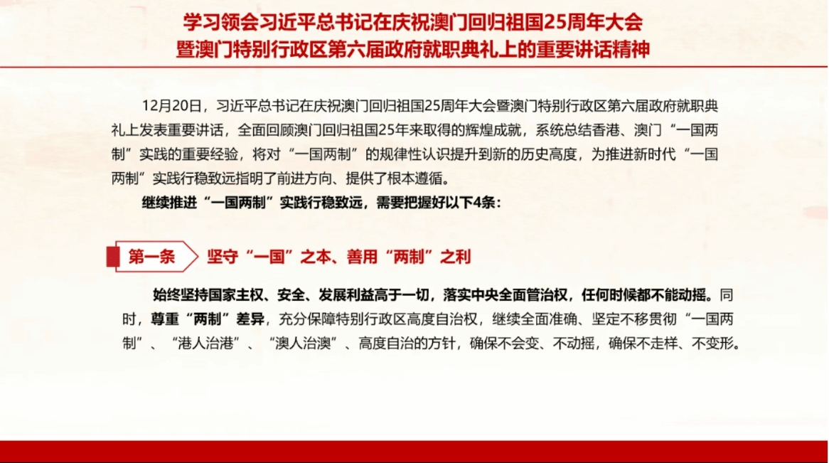 硕士法学第三党支部学习领会习近平总书记在庆祝澳门回归祖国25周年大会暨澳门特别行政区第六届政府就职典礼上的重要讲话精神。2024年12月20日,习近平总书记在庆祝澳门回归祖国25周年大会暨澳门特别行政区第六届政府就职典礼上发表重要讲话,全面回顾澳门回归祖国25年来取得的辉煌成就,系统总结香港、澳门“一国两制”实践的重要经验,将对“一国两制”的规律性认识提升到新的历史高度,为推进新时代“一国两制”实践行稳致远指明了前进方向、提供了根本遵循。支部全体党员纷纷表示要更加紧密地团结起来,要全面准确、坚定不移贯彻“一国两制”方针,在强国建设、民族复兴的伟大进程中谱写属于自己的崭新篇章。