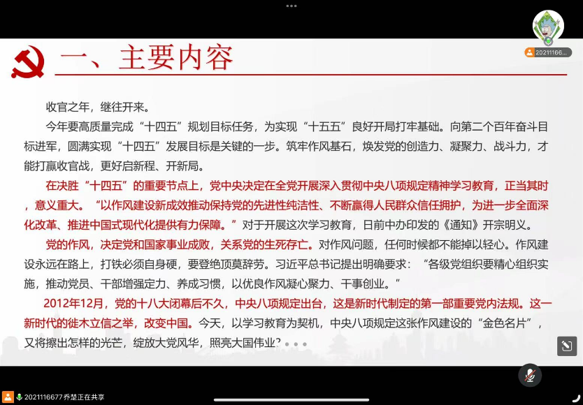 硕士公管安工第一党支部由陈美伶同志带领学习深入贯彻中央八项规定精神学习教育,强调学习教育的重要意义有为实现“十四五”目标提供保障、体现作风建设永远在路上、以作风建设推动高质量发展等。其次,带领学习新时代加强党的作风建设的重要论述,强调作风建设的重大意义、作风建设的明确要求以及作风建设的有效途径等。接着带领学习教育部直属高校学习教育综述,阐述高校学习教育的开展情况有提高政治站位,统一思想认识;坚持以上率下,全面有序启动;发扬特色优势,务求实干实效等。