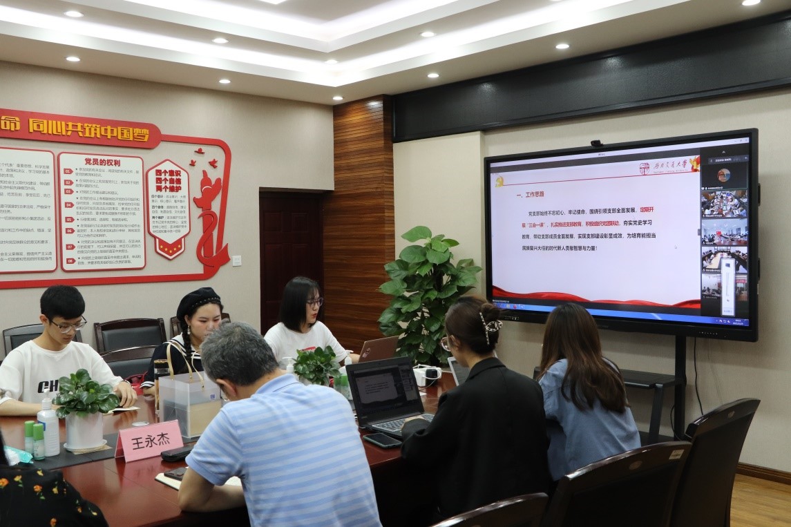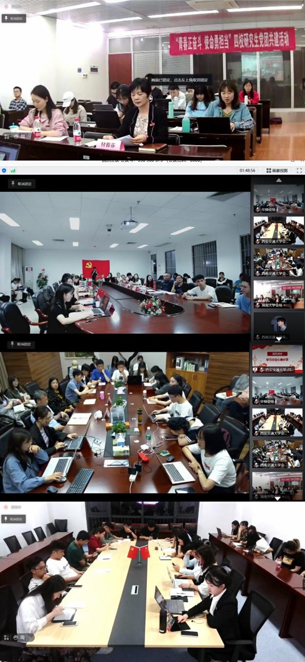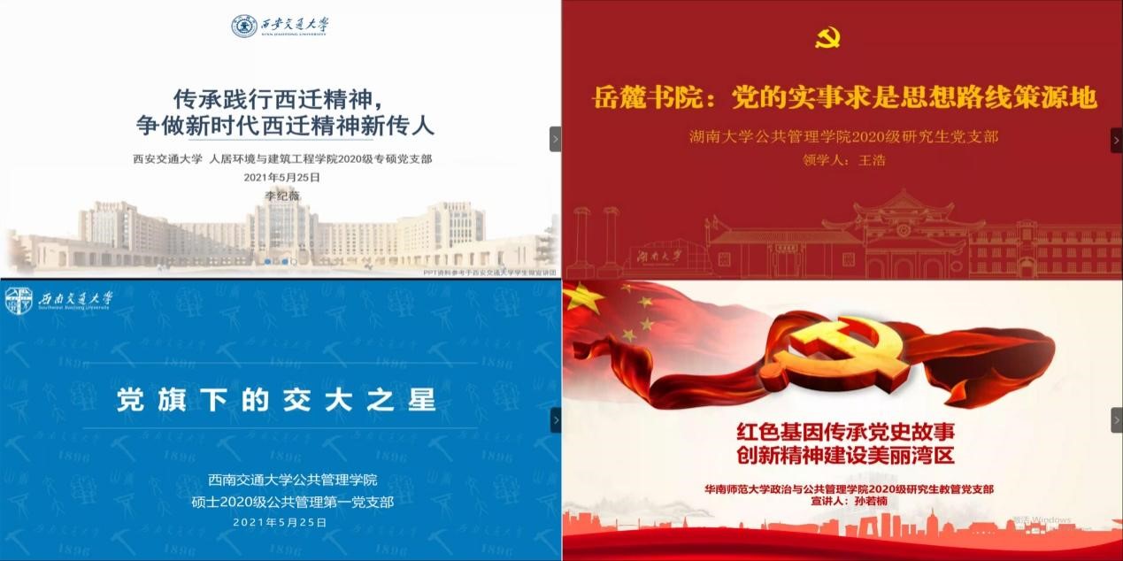 述往思来,向史而新。党的历史是最生动、最有说服力的教科书。我们党已经发展成为一个走过百年光辉历程、在最大的社会主义国家执政70多年、拥有9100多万党员的世界上最大的马克思主义执政党。重温党领导人民革命、改革、建设社会主义的历史进程,不难发现,百年历程离不开一代又一代心怀国运的中国青年,他们为国家富强、民族振兴、人民幸福不懈拼搏奋斗。为深化学生党员党史学习教育,用党的奋斗历程和伟大成就鼓舞青年党员斗志、明确方向,用党的光荣传统和优良作风坚定信念、凝聚力量,用党的实践创造和历史经验启迪智慧、砥砺品格。2021年5月25日,西南交通大学公共管理学院硕士2020级公共管理第一党支部联合西安交大人居学院2020级专硕党支部、湖南大学公共管理学院2020级研究生党支部、华南师范大学政治与公共管理学院2020级研究生职教党支部共同组织开展“青春正奋斗 使命勇担当”四校研究生党团共建活动。
