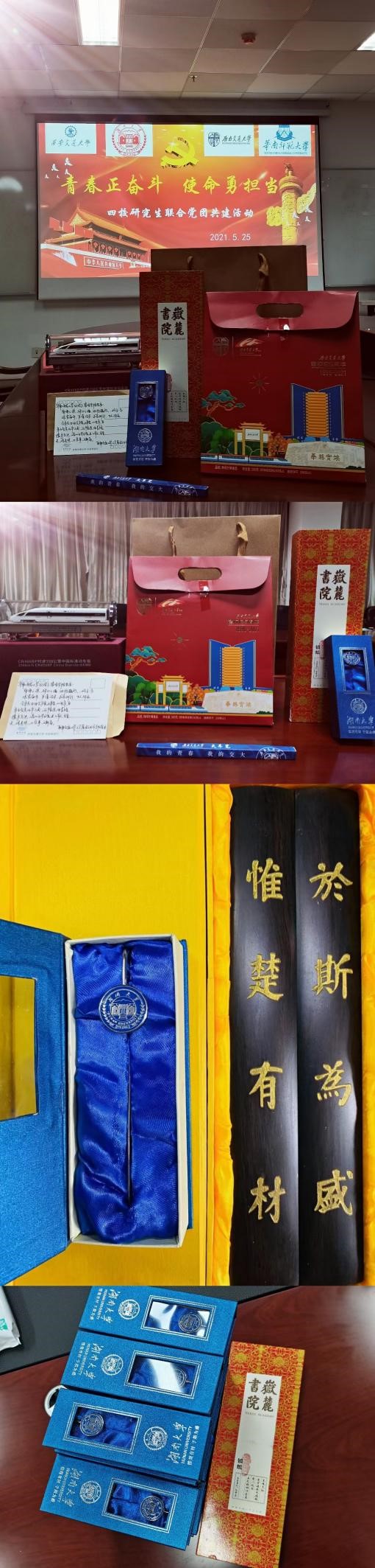 活动最后,各方互赠纪念品,各校领导发表总结讲话。湖南大学公共管理学院党委书记付蓉芬对此次活动的意义给予了充分肯定,她强调,党史学习尤为重要,知党史才能更加自觉牢记初心,明党史才能更加坚定担当使命。她鼓励青年党员应奋发有为,迎难而上,坚持学用结合、做到学以致用,从党的百年历史中,不断汲取前行的力量,把继承和发扬党的光荣传统和优良作风作为学习党史的出发点和落脚点。