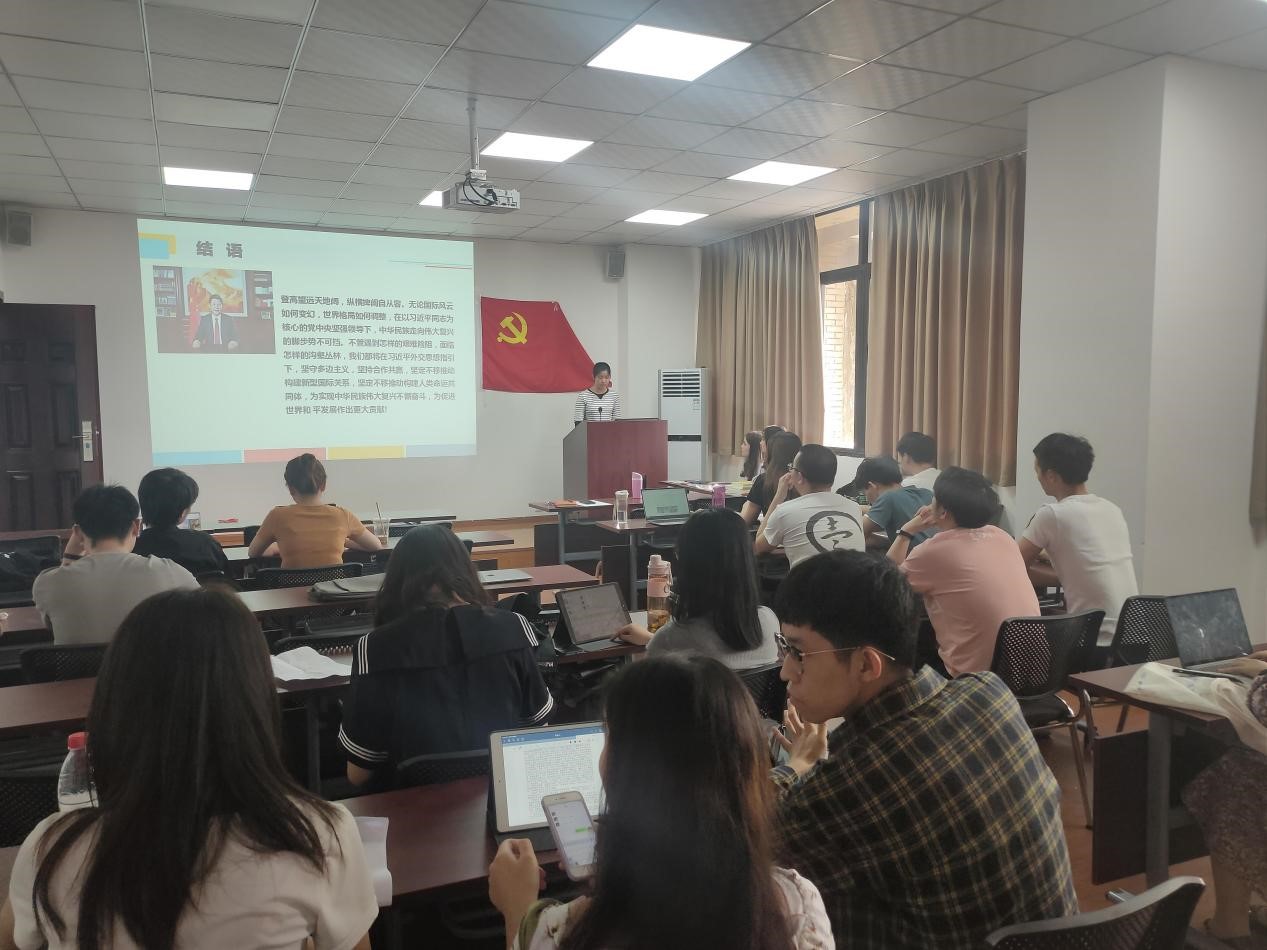 活动开始,余老师进行了有关百年未有之大变局的党课讲解。她在第一部分指出,我国在新时代中国外交的历史性成就是值得充分肯定的,从抗疫外交到全球治理,从服务国内到有力外交,我国外交成就举世瞩目。在第二部分,余书记介绍了百年大变局下的主要国家关系。最后一部分,从独立自主的和平外交政策,推动人类命运共同体不断走深走实、深化全方位外交布局,积极发展全球伙伴关系与中国负责任大国等角度对百年变局下中国外交的应对进行讲解。