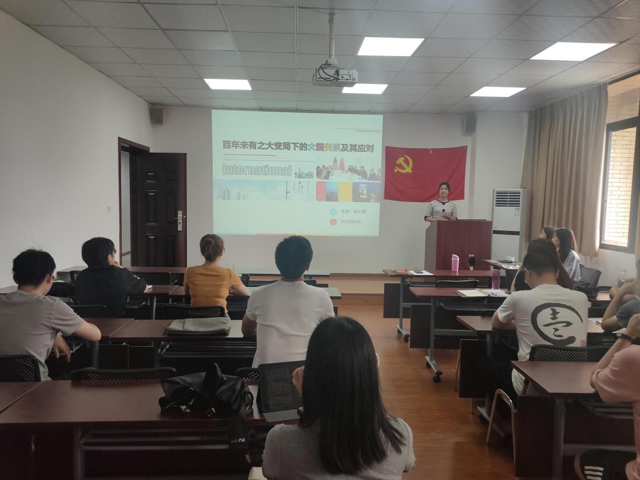 今年是中国共产党建党100周年,为加强党史学习教育,弘扬红色精神,全面认识中国共产党历史,进一步落实相关精神指示,硕士2020级法学第一党支部于2021年6月17日14:30,在西南交通大学九里校区零号楼1103开展以“百年未有之大变局下的大国关系及其应对”为主题的党课教育活动,本次活动由学院党委副书记余小英老师主讲,党支部书记肖秋月同志主持,支部全体成员参加此次会议。