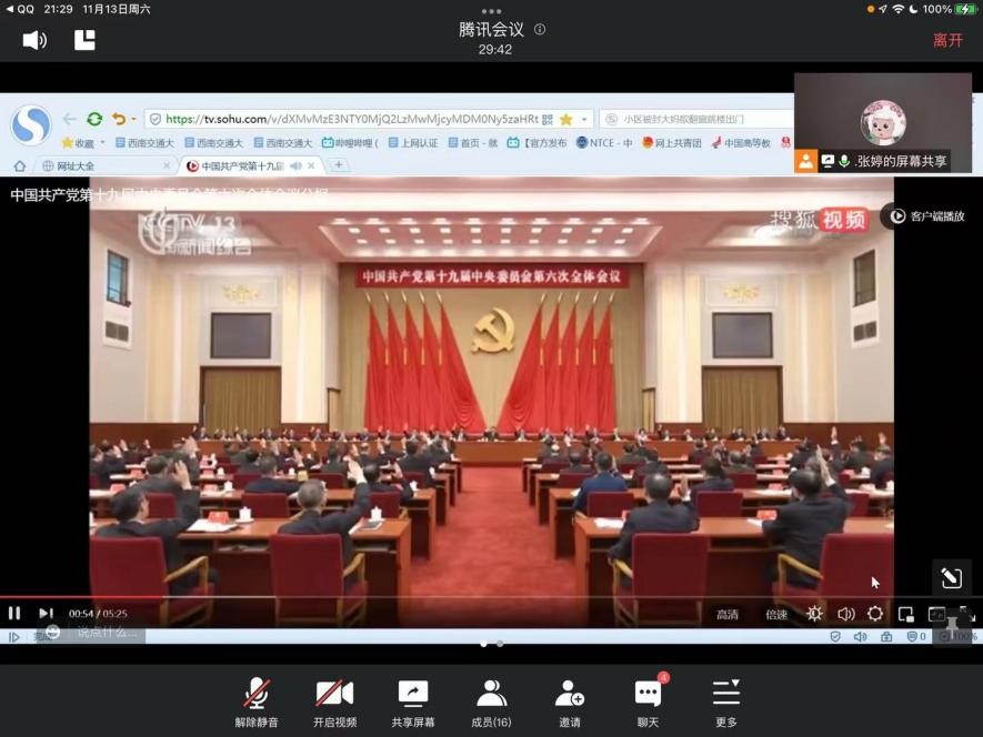 2021年11月13日晚九点,硕士公共管理2021级第二党支部全体党员同志参与党史学习教育专题之学习《习近平:用好红色资源赓续红色血脉,努力创造无愧于历史和人民的新业绩》、《共同构建人类命运共同体》、《中国共产党第十九届中央委员会第六次全体会议公报》,此次活动由党支部书记张婷主讲。