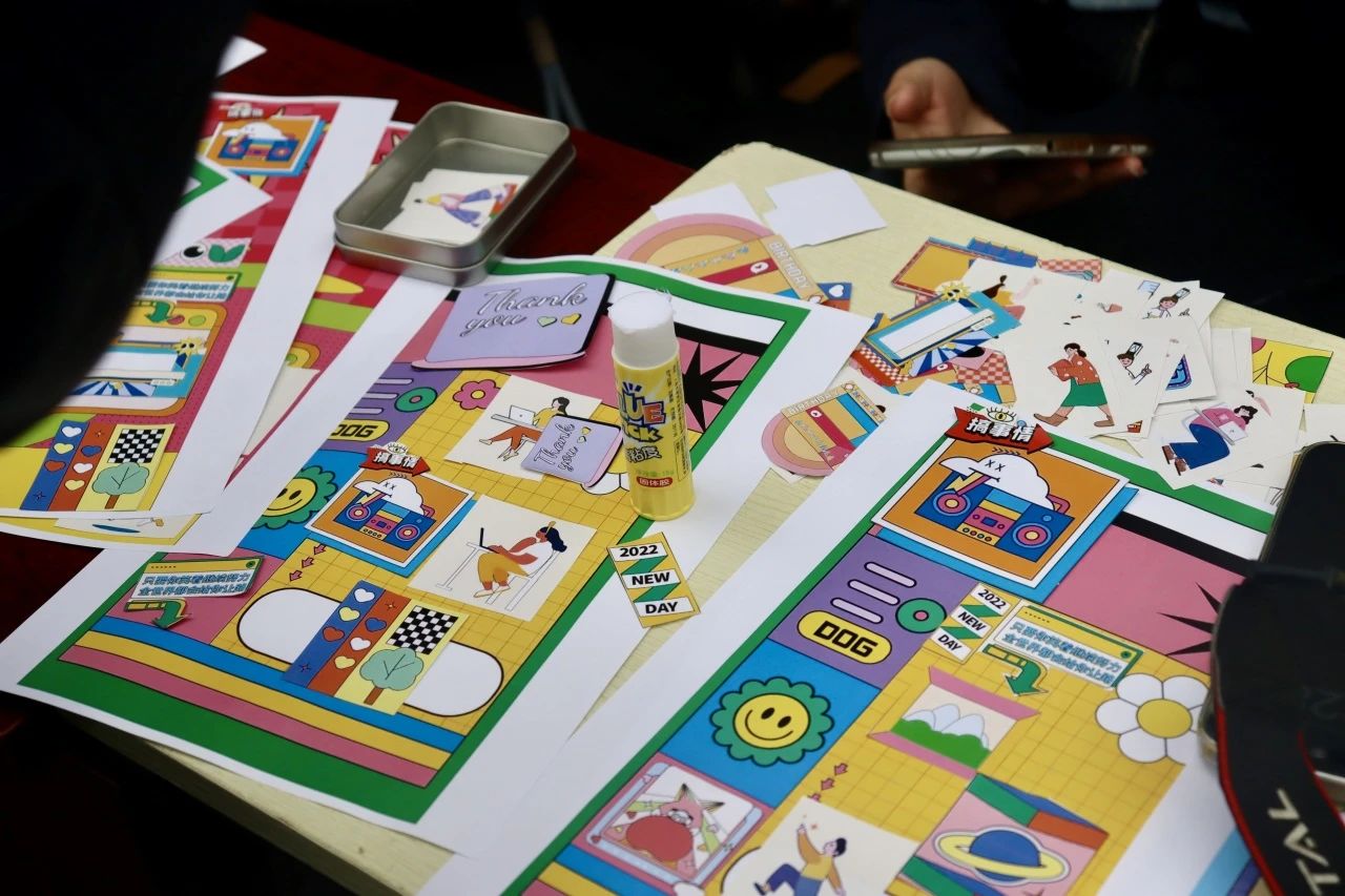 在本活动中,同学们可以用1-3个素材来共同设计拼贴海报,大家在现场充分体会到海报设计的乐趣与不易。现场创意迸发,同学们接龙拼贴自己心仪的素材贴纸,属于记者的创意精神也铭刻于大家心中。下面是本次活动中大家共同完成的海报: