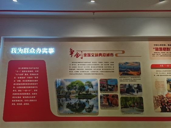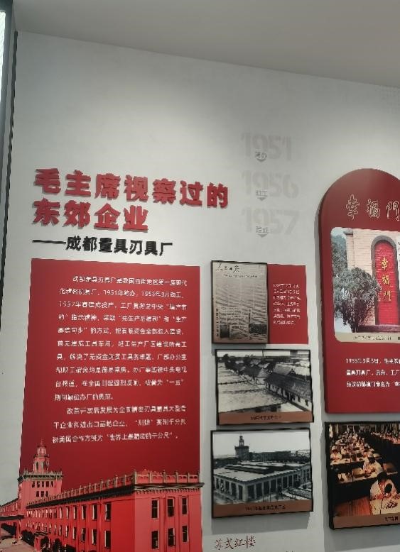 然后,陈岚书记带我们参观了党群服务中心三楼,这里打造了东郊华章主题展馆,包括“鎏金岁月”“时代华章”“放眼未来”三个板块,全景式呈现东郊工业波澜壮阔的发展历程,通过历史的记录,让社区居民能牢记历史,不忘初心,奋勇向前。