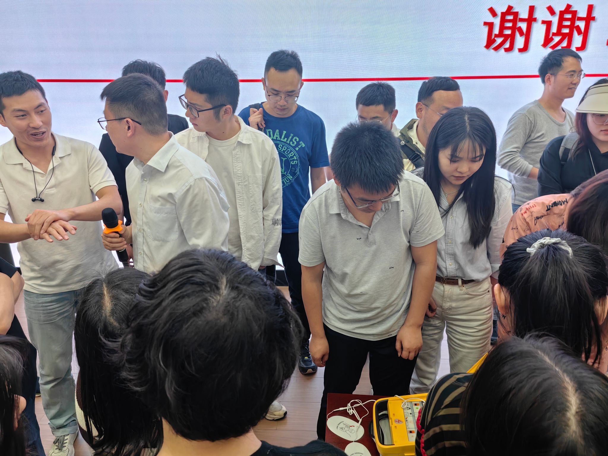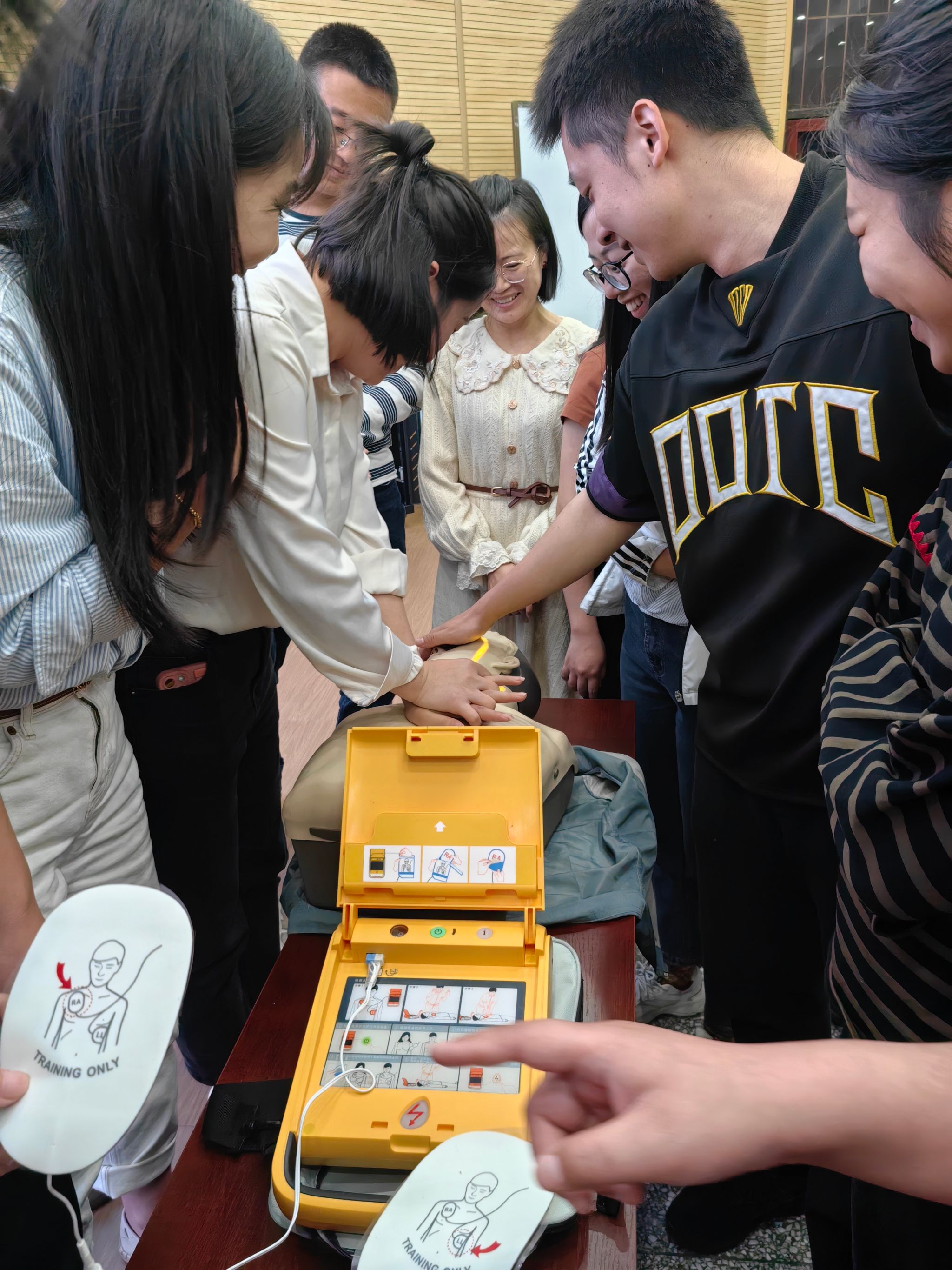 邓磊医生以两个错误急救的案例开头,首先为我们说明了掌握正确急救知识的重要性。紧接着,邓医生结合案例,向同学们介绍了生活中能遇见的紧急情况以及相应的应对措施,比如徒手心肺复苏(CPR)、体外自动除颤仪(AED)、海姆立克急救法、动物咬伤处理、烧伤急救和创伤急救等。其中,在讲到心肺复苏术时,邓医生特别强调了黄金救援时间的重要性,并通过假人现场演示了心肺复苏的正确步骤和注意事项。