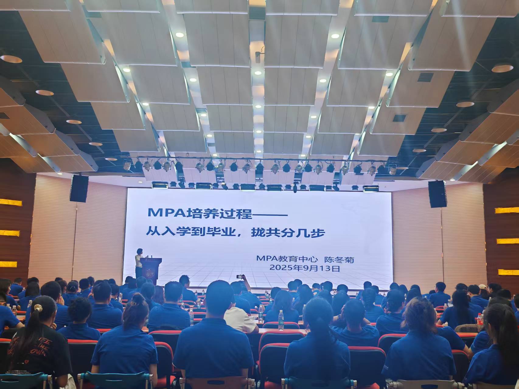 全体师生起身肃立,奏唱校歌《文轨车书郅大同》,“宜诚笃,宜勤朴,基础坚,事功崇……”悠扬激昂的旋律回荡在会场,其中不仅蕴含着学校百年传承的笃实品格与奋进精神,也凝聚着2025级MPA新生对求学新程的期待、对公共管理事业的热忱。