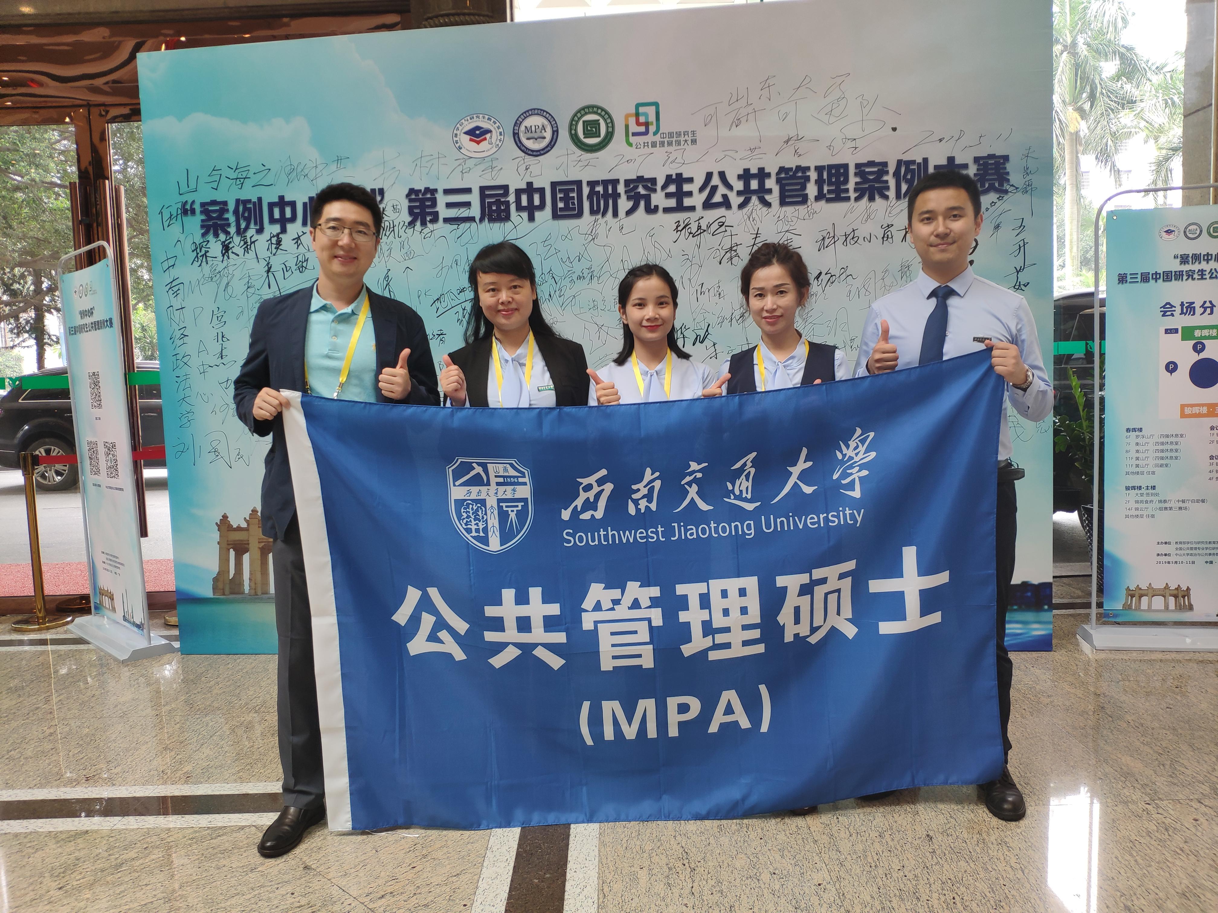2019年5月11日,“案例中心杯”第三届中国研究生公共管理案例大赛在广州中山大学隆重举行,我院代表队喜获佳绩。由刘鑫老师指导,我院肖敏、李婷婷、罗林、侯东东四位同学组成的“科技小岗村”代表队,从全国187所MPA培养院校的1106支参赛队伍中脱颖而出,代表西南交通大学首次进入全国32强。在5月11日广州中山大学举行的案例大赛决赛现场,斩获大赛三等奖!