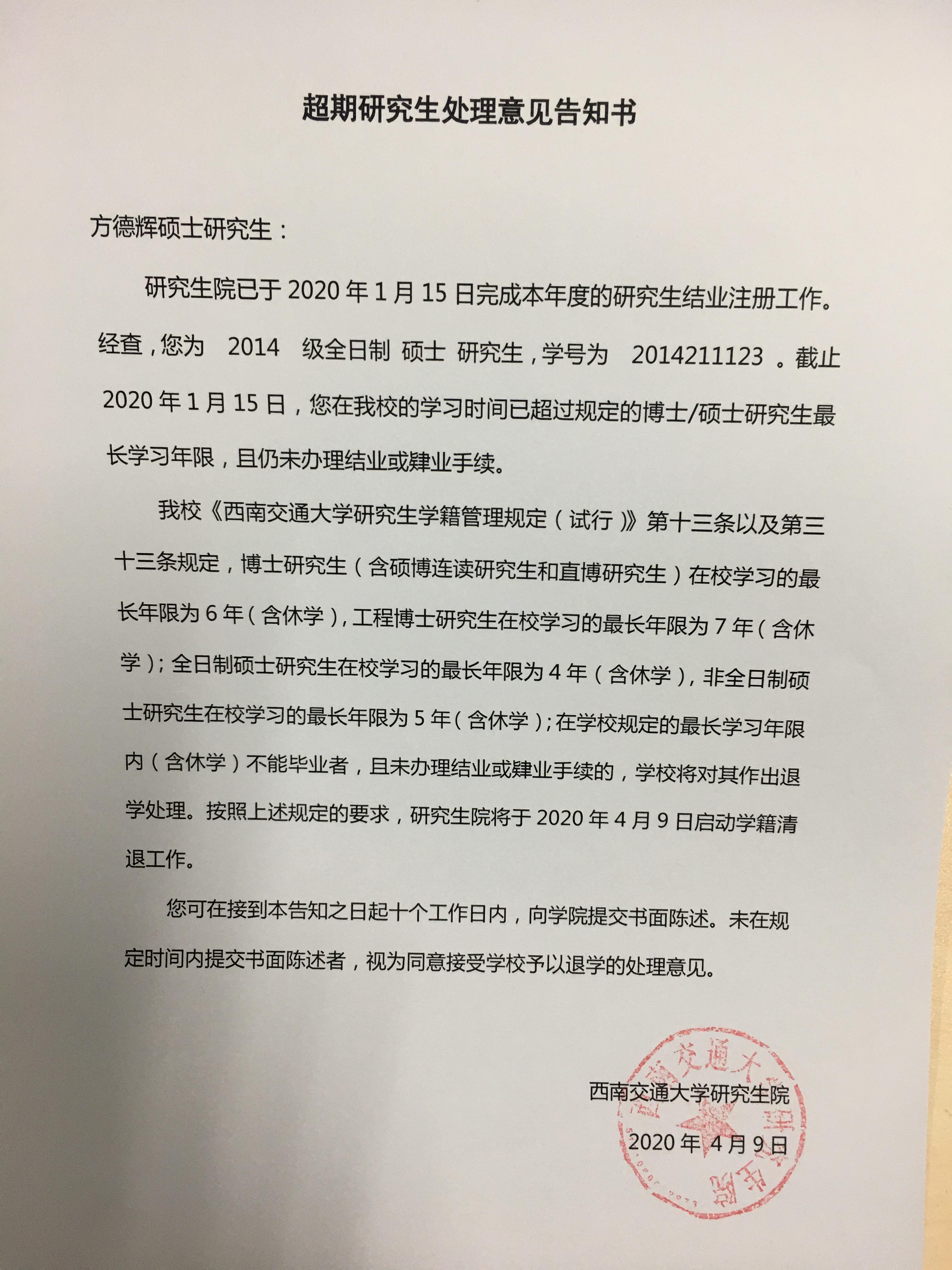 研究生院已于2020年 4月9日发布《超期研究生处理意见告知书》(简称《告知书》),并由学院组织将《告知书》送达至超出最长学习年限的研究生。