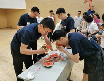 随后,“水果保卫战”、“气球保卫战”、“剪刀石头布”三项趣味横生的小游戏接踵而来。在这里,可以看见毫无形象可言的“吃西瓜大赛”,MPA师生共同低头狂啃手中的大西瓜,一顿风卷残云,引得围观的观众们捧腹大笑;在这里,可以看见脚上绑满气球的队员,想方设法去偷袭别组队员,踩中气球后露出狡黠一笑,溜之大吉;在这里,你可以看见泼“水”奋战的MPA学子斗智斗勇,强势出击,让在场的老师和同学们忍俊不禁,拍手叫绝!队员们在场上你争我夺,在良好的团队配合下每分必争,活动现场紧张而热烈。最终,MPA2020级1班的“无敌螃蟹队”勇夺桂冠!