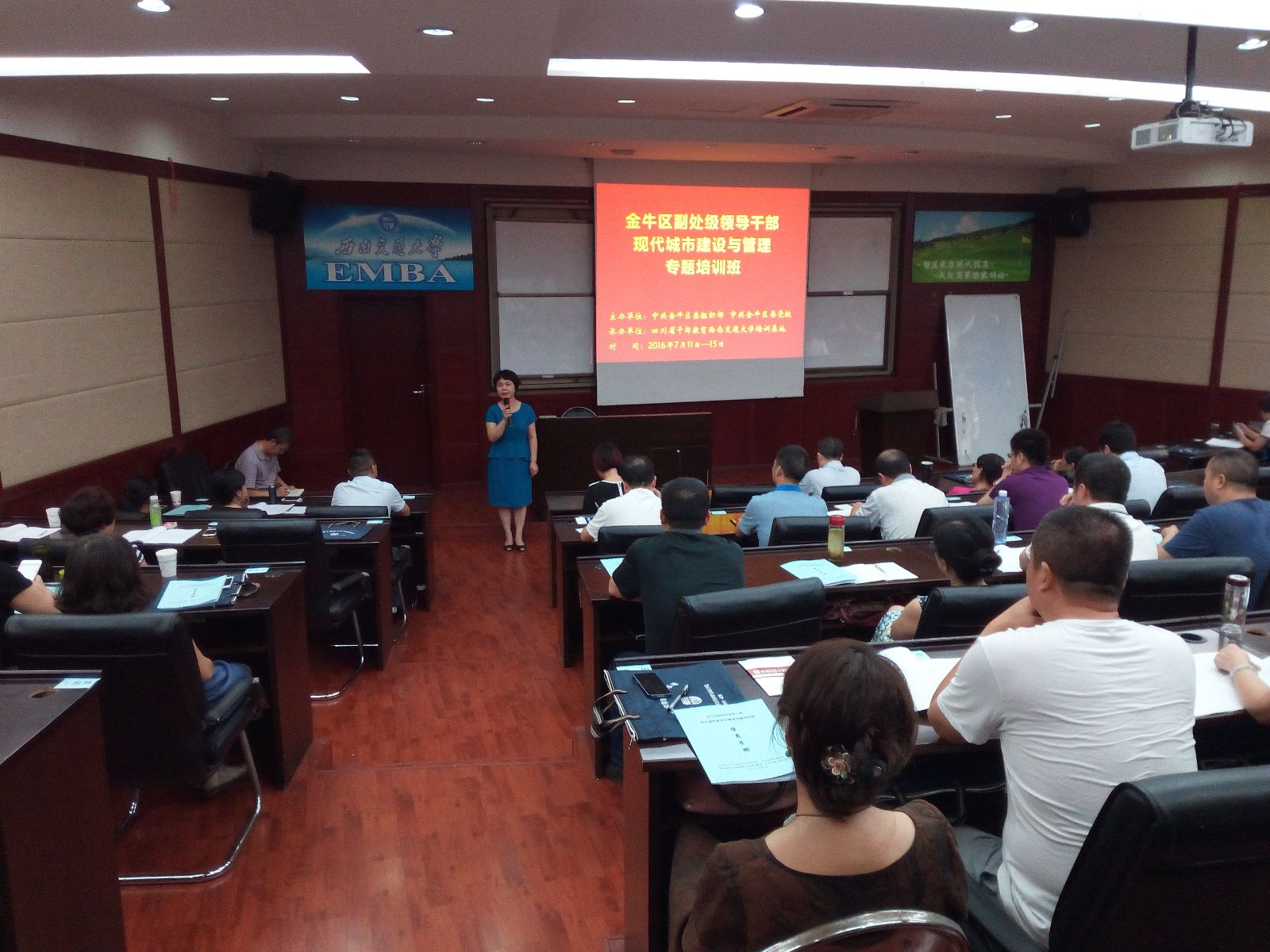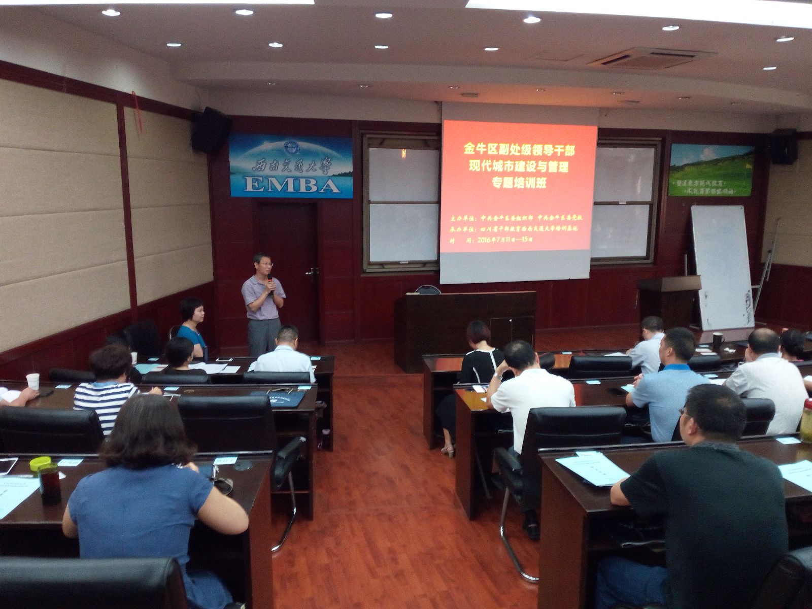 2016年7月11日,由中共金牛区委组织部、中共金牛区委党校主办,我校干训基地承办的金牛区副处级领导干部现代城市建设与管理专题培训班在我校顺利开班。中共金牛区委组织部副部长、区委党校常务副校长杨皎,西南交通大学公共管理学院党委书记王永杰,及来自金牛区各级党政机关的75名参训学员共同出席了开班典礼。