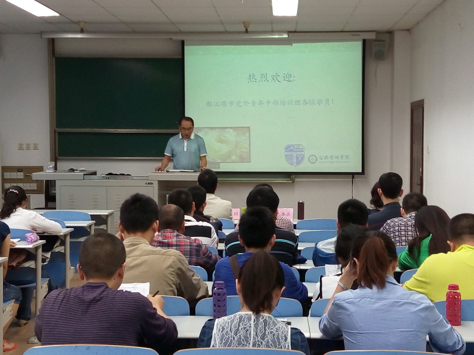 2014年9月22日上午,都江堰市党外干部青年培训班开班典礼在九里校区成功举行。中共都江堰市委党校袁华兵副校长,公共管理学院雷叙川副院长,及来自都江堰市各个单位的的39位党外干部学员共同出席了开班典礼。该培训班由中共都江堰市委党校委托,我校干训基地承办。